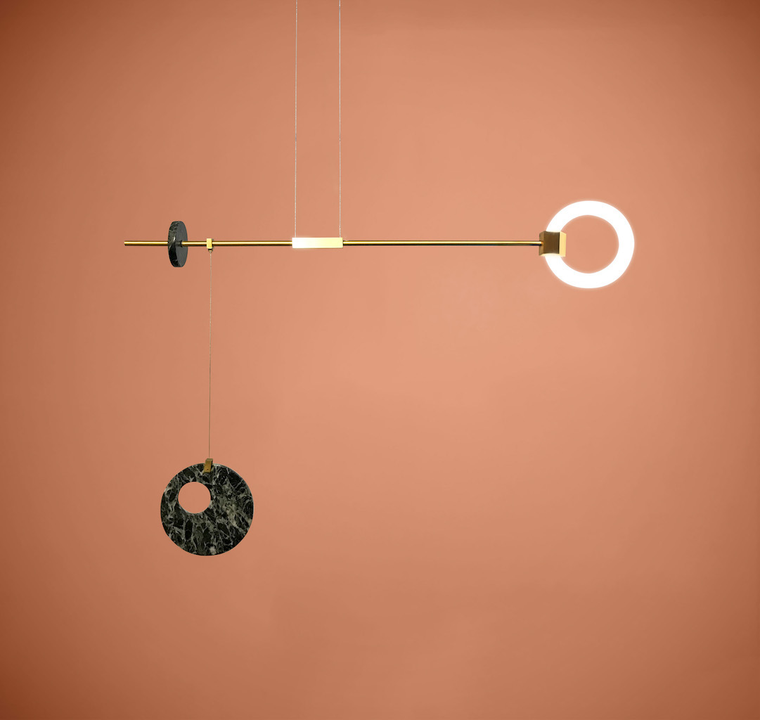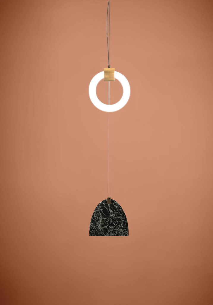 Ammetto le mie colpe: ho un debole per le geometrie e per i materiali, e durante le mie passeggiate per il Salone del Mobile non potevano sfuggirmi queste lampade in marmo e bronzo.