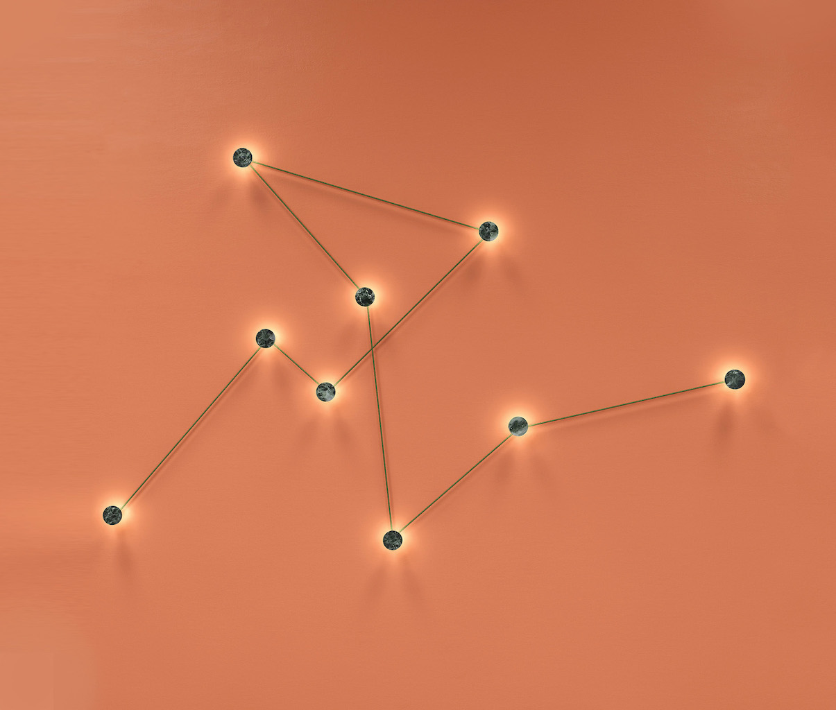 Come Azou, la lampada da parete, che racconta il viaggio nel mondo: come spilli che segnano le varie mete nel mappamondo, piccoli cerchi si dispongono nello spazio e si uniscono tra di loro.