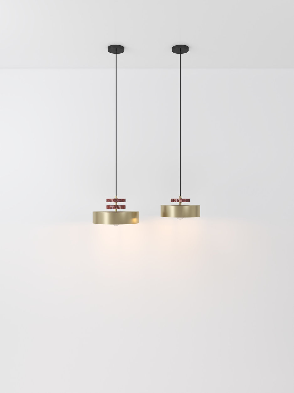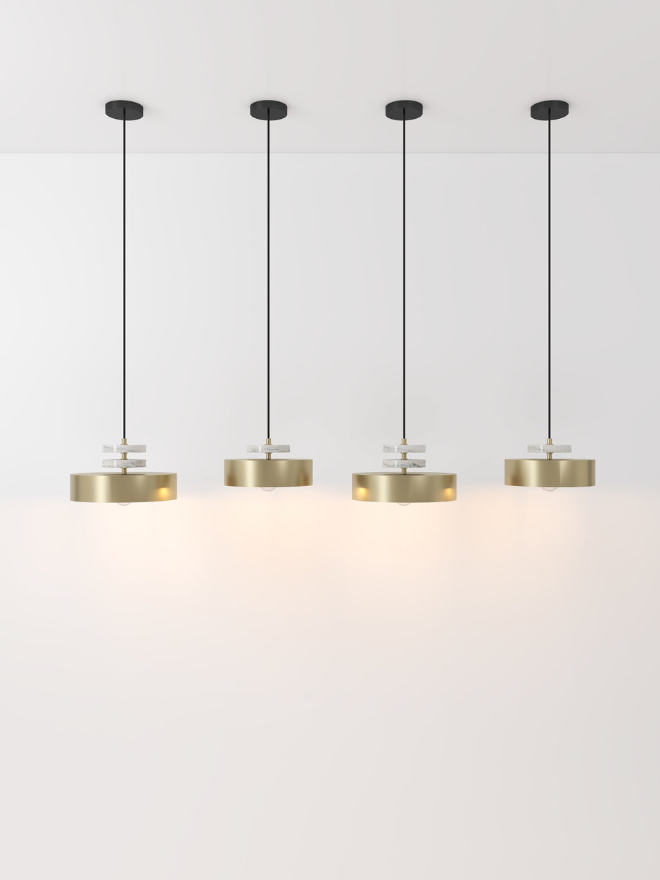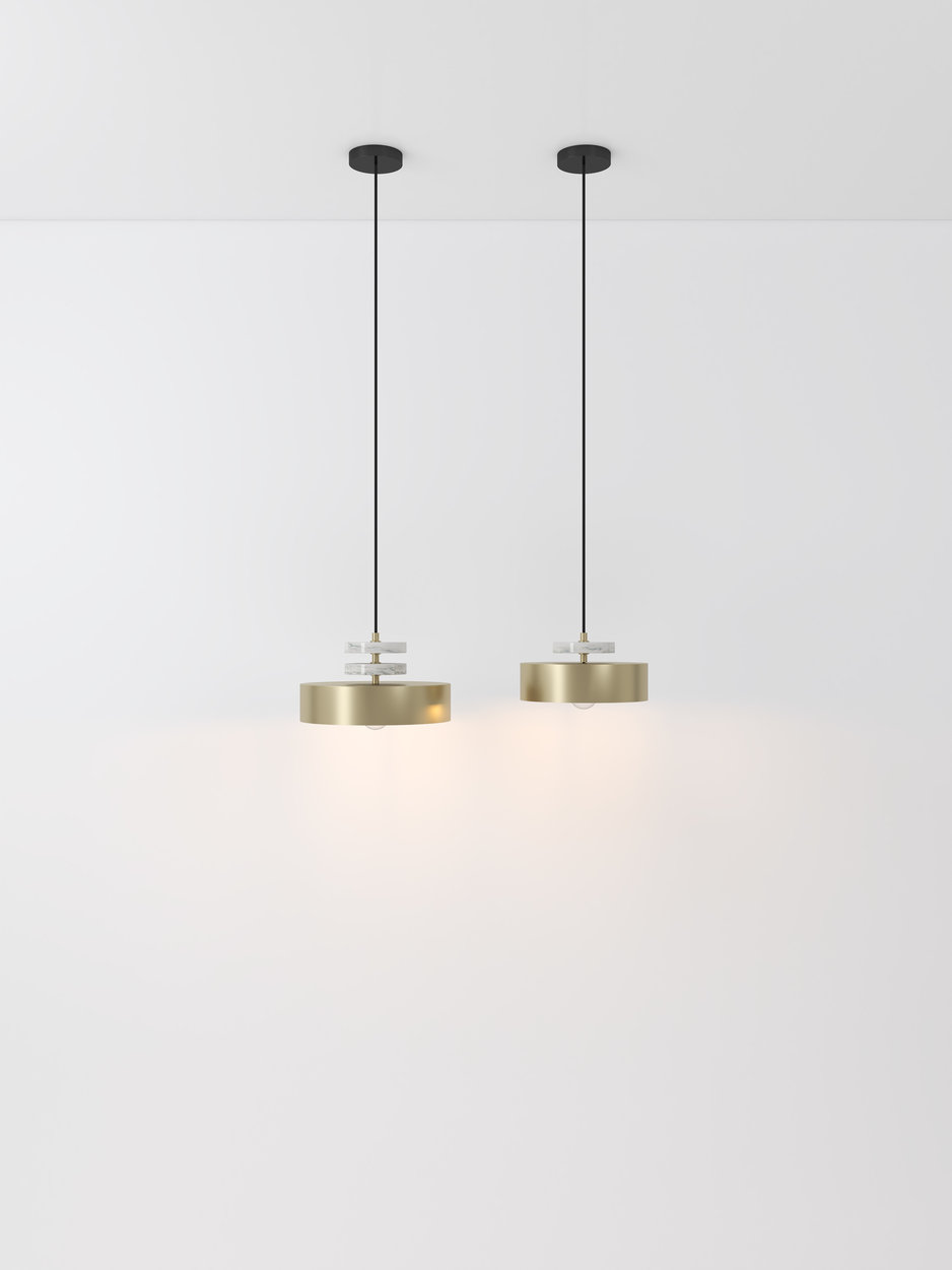 TRIADIC series presents a diverse collection of luminaries inspired by the iconic costumes of the Bauhaus Triadic Ballet. The TRIADIC X features wide cylindrical metal shapes harmoniously combined with one or two marble disks and brass details. This design provides downlighting, creating a captivating atmosphere available in various colors, finishes, and sizes, making it suitable for any interior setting.
