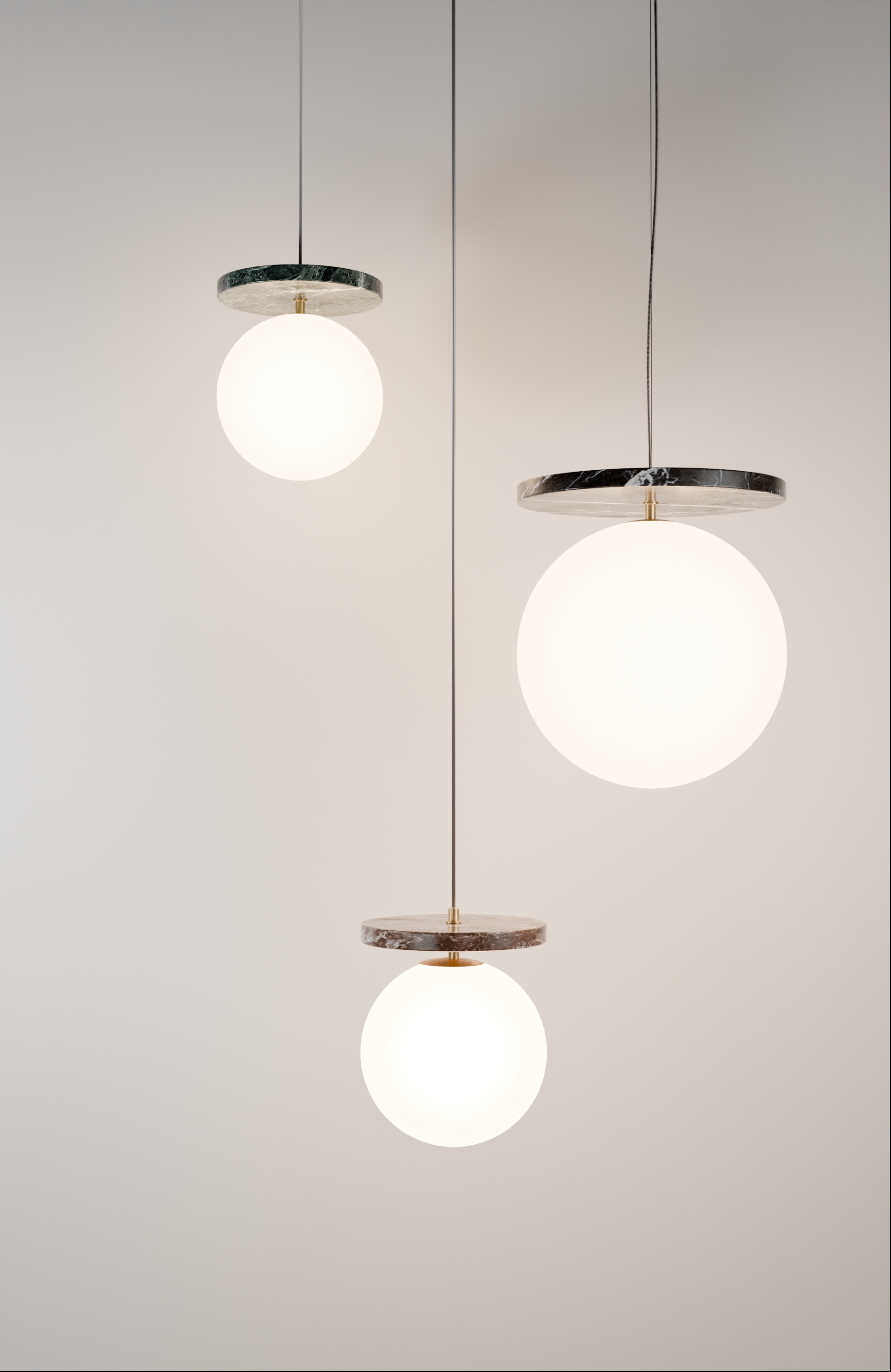 LUA L, “moon” in Portuguese. The opal sphere-shaped diffuser, crafted from two layers of mouthblown glass with a matte finish, creates a warm and inviting atmosphere in any space. Meanwhile, the marble and brass components add a subtle touch of luxury and timeless elegance. Whether you choose to incorporate two elements or an infinite number, LUA allows you to design stunning chandeliers in various shapes and sizes, from cascading installations to strings of lights, providing a customized solution for every project.