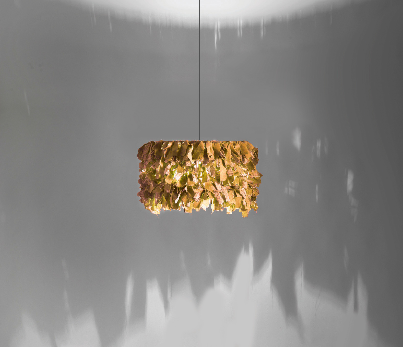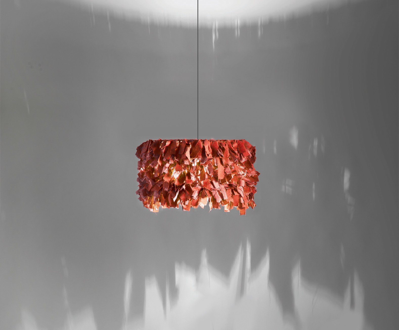 A pendant lamp that has a headpiece shade of cylindrical shape. The lamp’s shade is covered with textile strips that are available for selection in the shades of gray, yellow, or red. This light emits a lighting effect of a beautiful and asymmetrical shadow.