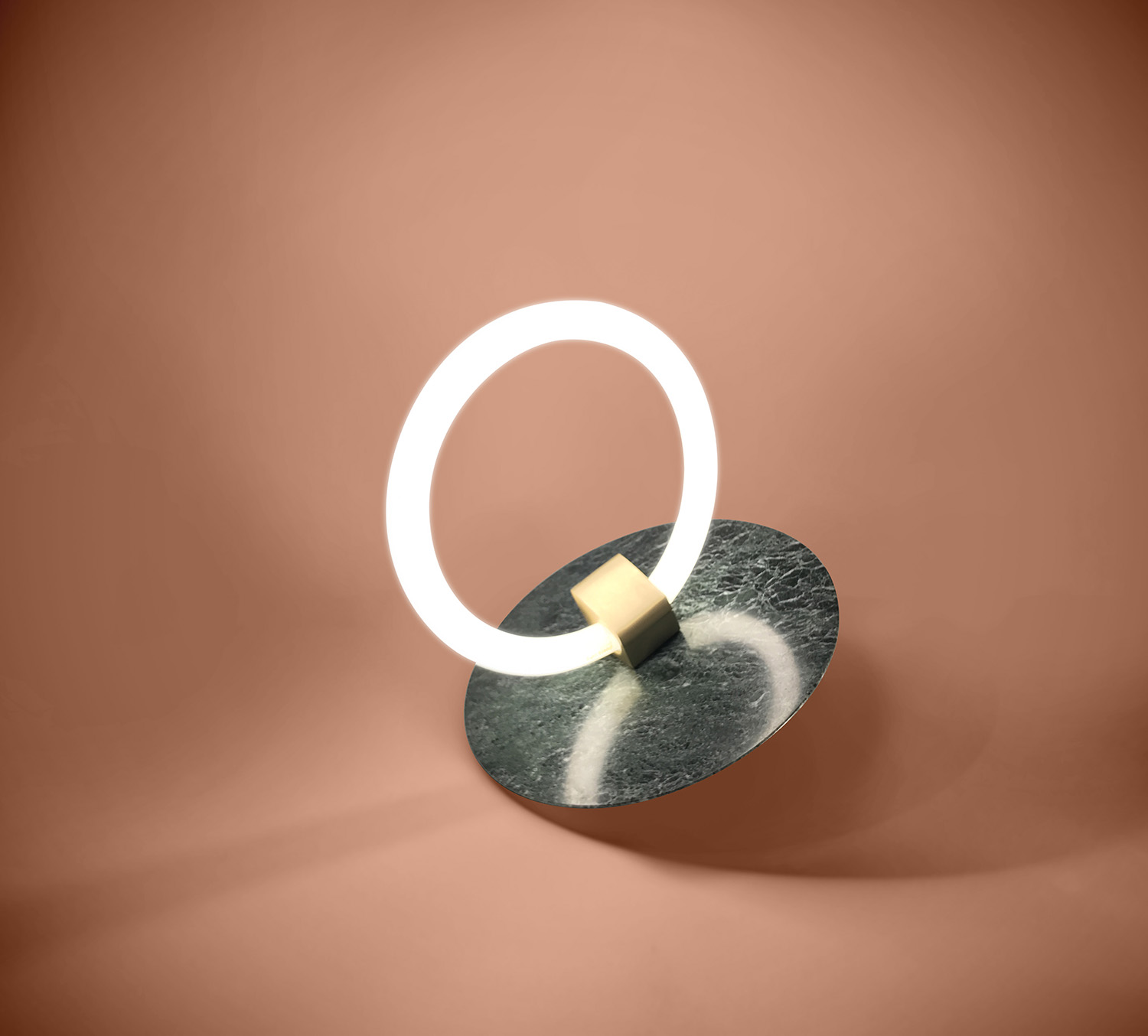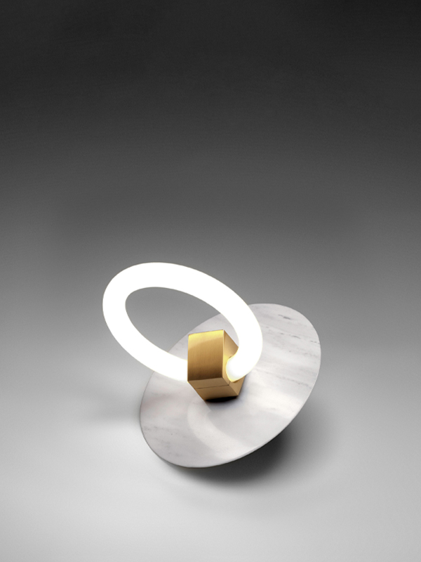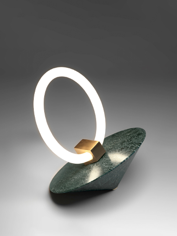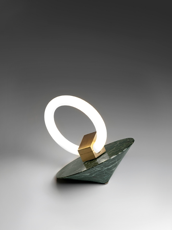 HELEN is versatile ring-shaped lamp can be elegantly displayed on a table or floor. Its conical base, inspired by the form of a diamond, is made of solid marble, allowing for effortless rotation while ensuring stability. The handcrafted bulb holder, crafted using traditional sand-casting techniques, features an engraved LED halo light source, seamlessly blending sophistication with functionality in a striking design.